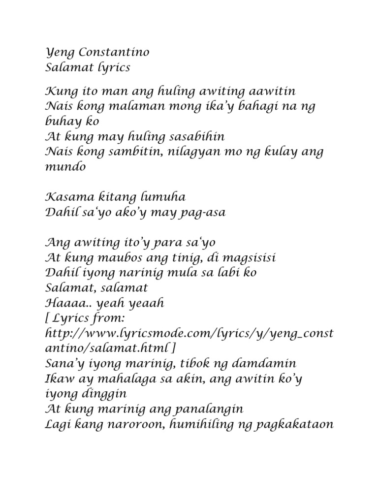 Kung ito man ang huling awiting aawitin. Dahil iyong narinig mula sa labi ko. Features Song Lyrics for Yeng Constantinos Salamat album.